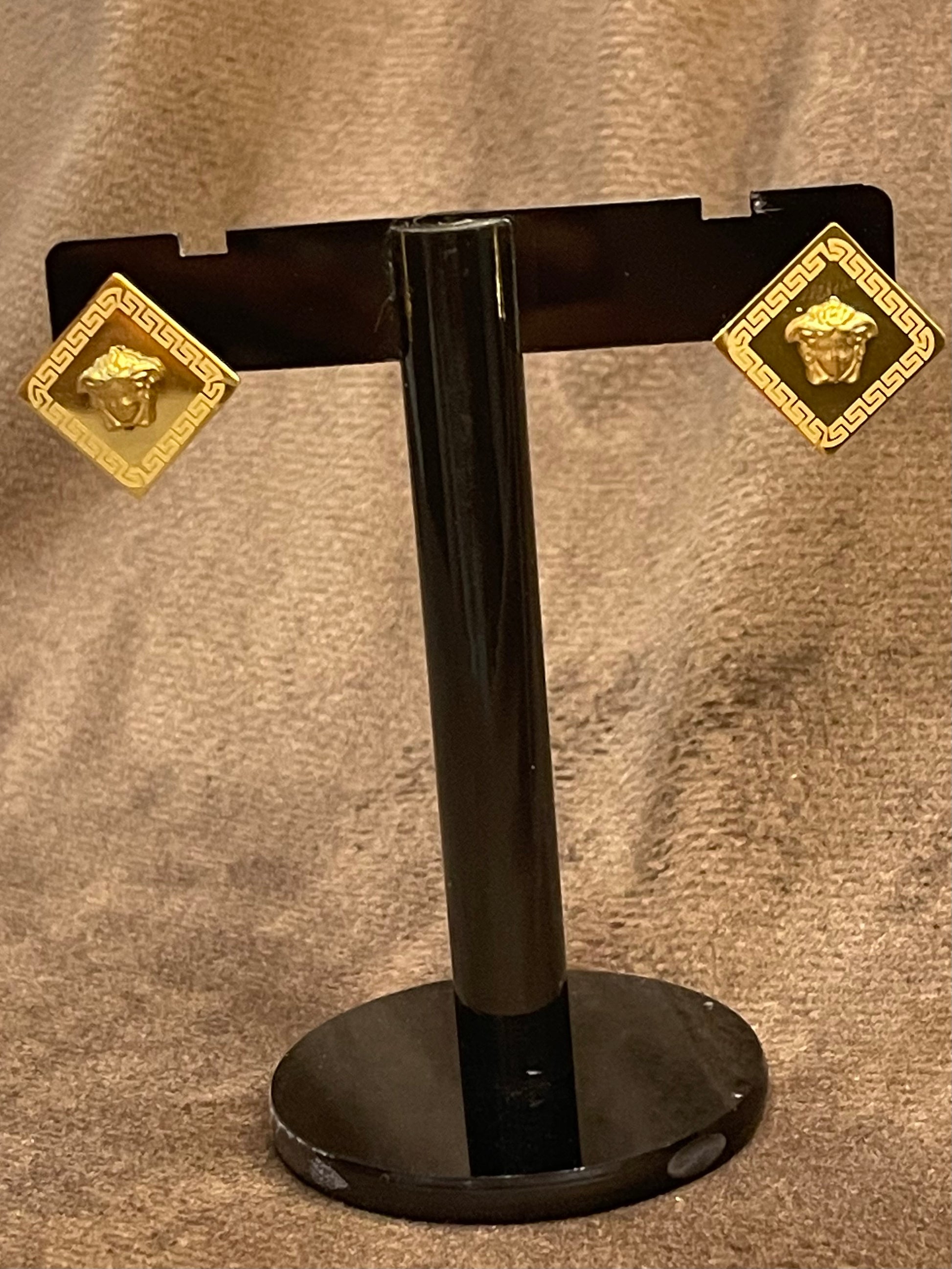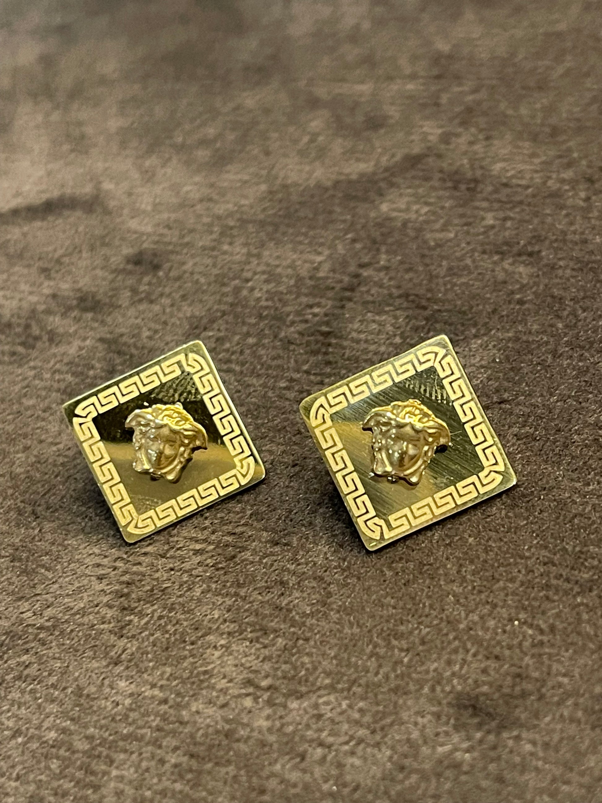 A pair of sophisticated gold Earrings featuring a Medusa head design at the center, surrounded by a Greek key pattern border. Placed on a brown fabric surface with a black and white diamond-patterned backdrop, these cufflinks exude luxury and style.
