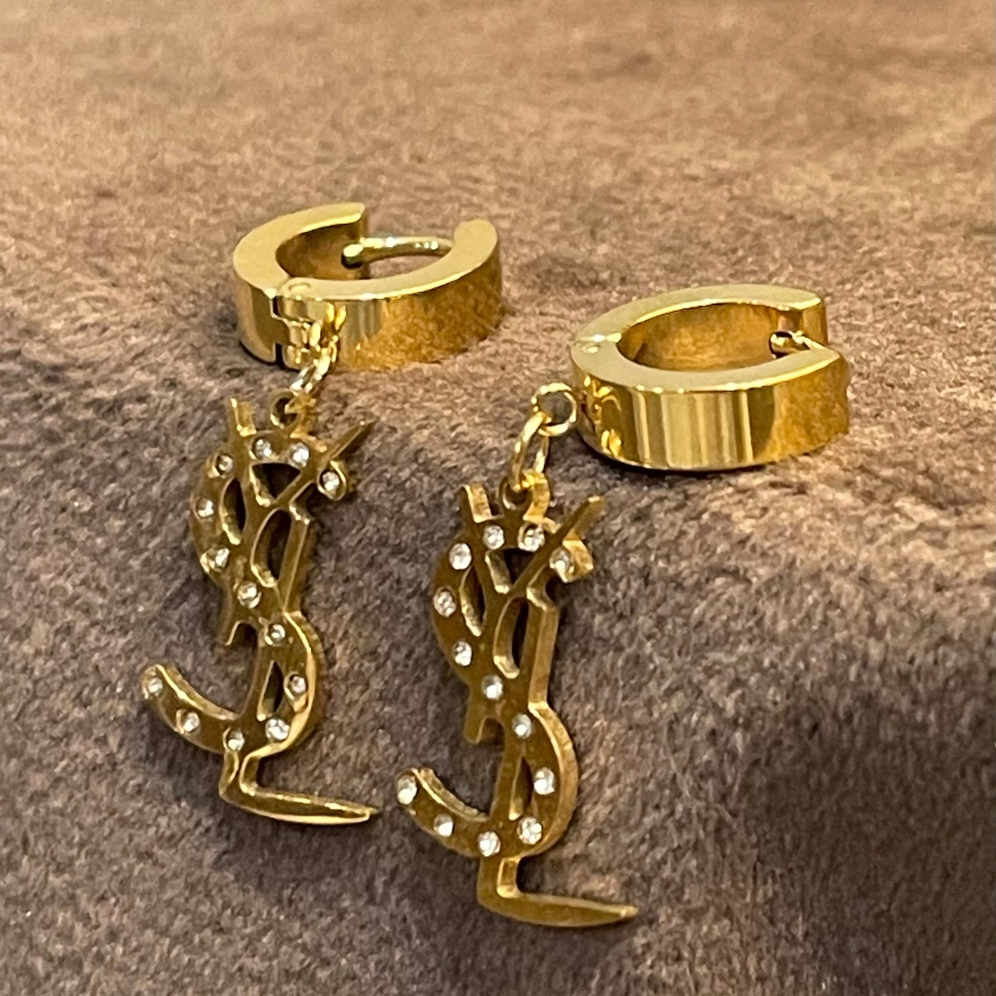 A pair of gold YSL earrings featuring the iconic YSL logo adorned with rhinestones. The earrings have a gold hoop base with a dangling YSL charm, adding a touch of luxury and sophistication to any outfit.
